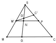\(\begin{array}{l}\dfrac{{G'S}}{{G'N}} = \dfrac{{NG'}}{{SG'}} = \dfrac{{SN - SG'}}{{SG'}} = \dfrac{{\dfrac{1}{2}SG}}{{SG'}} - 1 = \dfrac{1}{2}\dfrac{{SG}}{{SG'}} - 1\\\dfrac{{C'P}}{{C'S}} = \dfrac{{PC'}}{{SC'}} = \dfrac{{SP - SC'}}{{SC'}} = \dfrac{{\dfrac{1}{2}SC}}{{SC'}} - 1 = \dfrac{1}{2}\dfrac{{SC}}{{SC'}} - 1\end{array}\)
