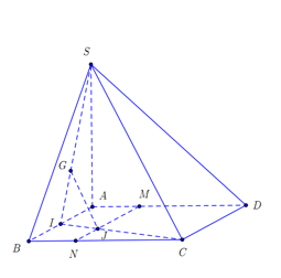 Ta có: \(\frac{{IJ}}{{IC}} = \frac{{AM}}{{AD}} = \frac{1}{3} = \frac{{IG}}{{IS}} \Rightarrow JG//SC \Rightarrow \left\{ \begin{array}{l}JG//\left( {SCD} \right)\\JG//\left( {SAC} \right)\\JG//\left( {SBC} \right)\end{array} \right.\).