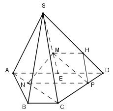 Ta có: \({{SM} \over {SE}} = {{SH} \over {SD}} = {2 \over 3} \Rightarrow MH//AD//NP \Rightarrow M,H,P,N\) đồng phẳng.
