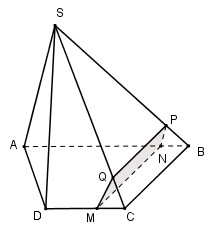 \(\eqalign{ & \left\{ \matrix{N \in \left( \alpha \right) \cap \left( {SAB} \right) \hfill \cr SA\parallel \left( \alpha \right) \hfill \cr SA \subset \left( {SAB} \right) \hfill \cr} \right. \Rightarrow \left( \alpha \right) \cap \left( {SAB} \right) = NP\parallel SA\,\left( {P \in SB} \right) \cr & \left\{ \matrix{P \in \left( \alpha \right) \cap \left( {SBC} \right) \hfill \cr BC\parallel \left( \alpha \right) \hfill \cr BC \subset \left( {SBC} \right) \hfill \cr} \right. \Rightarrow \left( \alpha \right) \cap \left( {SBC} \right) = PQ\parallel BC\,\left( {Q \in SC} \right)\,\,\left( 2 \right). \cr} \)