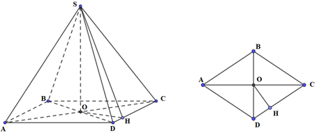 Tính thế tích khối chóp S.ABCD:  \({V_{S.ABCD}} = \frac{1}{3}.SO.{S_{ABCD}} = \frac{1}{3}.\frac{{3a}}{4}.\frac{{{a^2}\sqrt 3 }}{2} = \frac{{{a^3}\sqrt 3 }}{8}\).
