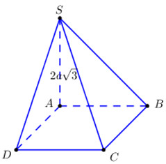 Thể tích khối chóp \(S.ABCD\) là: \(V = \dfrac{1}{3}.4{a^2}.2a\sqrt 3 = \dfrac{{8\sqrt 3 {a^3}}}{3}\).