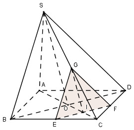 Ta có: \(\left\{ \matrix{ \left( {GEF} \right) \cap \left( {SBC} \right) = GE \hfill \cr \left( {SBD} \right) \cap \left( {SBC} \right) = SB \hfill \cr \left( {GEF} \right)//\left( {SBD} \right) \hfill \cr} \right. \Rightarrow GE//SB\)