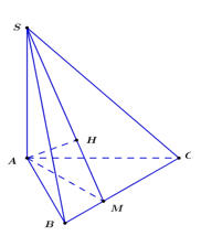 \(\begin{array}{l}\left\{ \begin{array}{l}BC \bot AM\\BC \bot SA\end{array} \right. \Rightarrow BC \bot \left( {SAM} \right) \Rightarrow BC \bot AH.\\\left\{ \begin{array}{l}AH \bot SM\\AH \bot BC\end{array} \right. \Rightarrow AH \bot \left( {SBC} \right)\\ \Rightarrow d\left( {A;\;\left( {SBC} \right)} \right) = AH.\end{array}\)