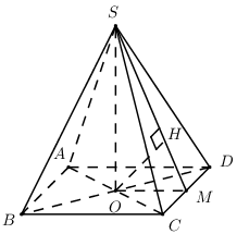 \(\left\{ \begin{array}{l}OH \bot SM\\OH \bot CD\end{array} \right. \Rightarrow OH \bot \left( {SCD} \right) \Rightarrow d\left( {O;\left( {SCD} \right)} \right) = OH\).
