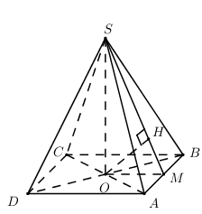 \(\begin{array}{l}\left\{ \begin{array}{l}AB \bot OM\\AB \bot SO\,\,\left( {SO \bot \left( {ABCD} \right)} \right)\end{array} \right. \Rightarrow AB \bot \left( {SOM} \right) \Rightarrow AB \bot OH\\\left\{ \begin{array}{l}OH \bot SM\\OH \bot AB\end{array} \right. \Rightarrow OH \bot \left( {SAB} \right) \Rightarrow d\left( {O;\left( {SAB} \right)} \right) = OH = 3\end{array}\).