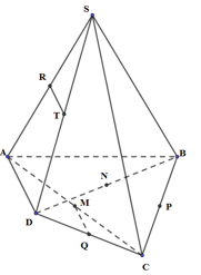 Cho hình chóp tứ giác S.ACBD, gọi M, N, P, Q, R, T lần lượt là trung điểm của AC, BD, BC, CD, SA, SD. Bốn điểm nào sau đây đồng phẳng?