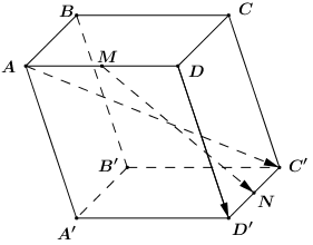 Cho hình hộp \(ABCD.A'B'C'D'\). Gọi \(M,\,\,N\) lần lượt là trung điểm \(AD,\,\,C'D'\). Chứng minh rằng ba vectơ \(\overrightarrow {MN} ,\,\,\overrightarrow {AC'} ,\,\,\overrightarrow {DD'} \) đồng phẳng.
