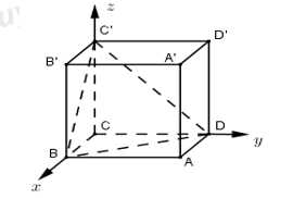 Ta suy ra tọa độ các điểm \(C\left( 0;0;0 \right);\,\,B\left( 2;0;0 \right);\,\,D\left( 0;1;0 \right);\,\,C'\left( 0;0;3 \right);\,\,A'\left( 2;1;3 \right)\)