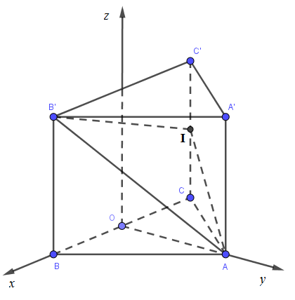 Trong đó,\(O(0;0;0),\,\,A\left( 0;\frac{a}{2};0 \right),\,\,B'\left( \frac{a\sqrt{3}}{2};0;a \right),\,\,\,I\left( -\frac{a\sqrt{3}}{2};0;\frac{a}{2} \right)\)