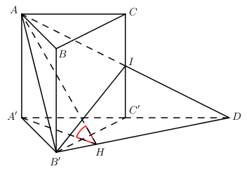 \(\begin{array}{l}\left\{ \begin{array}{l}A'H \bot B'D\\AA' \bot B'D\end{array} \right. \Rightarrow B'D \bot \left( {AA'H} \right) \Rightarrow AH \bot B'D\\\left\{ \begin{array}{l}\left( {AB'I} \right) \cap \left( {A'B'C'} \right) = B'D\\\left( {A'B'C} \right) \supset A'H \bot B'D\\\left( {AB'I} \right) \supset AH \bot B'D\end{array} \right.\\ \Rightarrow \widehat {\left( {\left( {AB'I} \right);\left( {A'B'C'} \right)} \right)} = \widehat {\left( {A'H;AH} \right)} = \widehat {AHA'}\end{array}\)