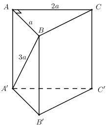 Cho hình lăng trụ đứng \(ABC.A'B'C'\) có đáy \(ABC\) là tam giác vuông tại \(A,\) biết \(AB = a,\,\,AC = 2a\) và \(A'B = 3a\). Tính thể tích của khối lăng trụ \(ABC.A'B'C'\).