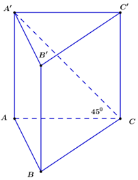 Cho hình lăng trụ tam giác đều \(ABC.A'B'C'\) có \(AB = a\) , góc giữa đường thẳng \(A'C\) và mặt phẳng \(\left( {ABC} \right)\) bằng \({45^0}\) . Thể tích của khối lăng trụ \(ABC.A'B'C'\) bằng