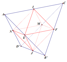 Gọi E, F, I, J, M, N lần lượt là tâm của sáu mặt của hình lập phương (như hình vẽ), khi đó: E, F, I, J, M, N là đỉnh của một bát diện đều.Thật vậy, xét tứ diện đều ACB’D’ khi đó E, F, I, J, M, N là trung điểm của các cạnh của tứ diện nên mỗi mặt của bát diện là những tam giác đều bằng nhau có cạnh bằng \(\dfrac{{AC}}{2}\)