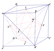 Gọi E, F, I, J, M, N lần lượt là tâm của sáu mặt của hình lập phương (như hình vẽ), khi đó: E, F, I, J, M, N là đỉnh của một bát diện đều.Thật vậy, xét tứ diện đều ACB’D’ khi đó E, F, I, J, M, N là trung điểm của các cạnh của tứ diện nên mỗi mặt của bát diện là những tam giác đều bằng nhau có cạnh bằng \(\dfrac{{AC}}{2}\)