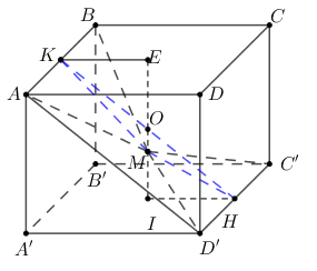 Khi đó \(\left( {\left( {MC'D'} \right),\left( {MAB} \right)} \right) = \left( {MH,MK} \right) = \varphi \Rightarrow \cos \varphi = \left| {\cos \widehat {HMK}} \right|\)