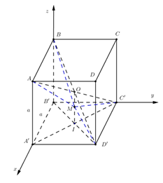 A\left( {a;\;0;\;a} \right),\;I\left( {\frac{a}{2};\;\frac{a}{2};\;0} \right),\;B\left( {0;\;0;\;a} \right),\;O\left( {\frac{a}{2};\;\frac{a}{2};\;\frac{a}{2}} \right).\\