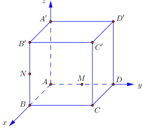 Cho hình lập phương ABCD.A’B’C’D’. Gọi M, N lần lượt là trung điểm các cạnh AD, BB’. Tính cosin của góc giữa hai đường thẳng MN và AC’?