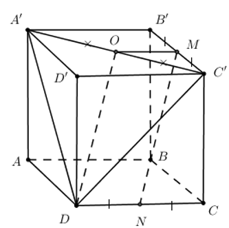 Từ (1) và (2) \(\Rightarrow \left\{ \begin{align} & OM\parallel DN \\ & OM=DN \\\end{align} \right.\Rightarrow \) Tứ giác MNDO là hình bình hành \(\Rightarrow\) \(MN\parallel DO\Rightarrow MN\parallel \left( DA'C' \right)\)