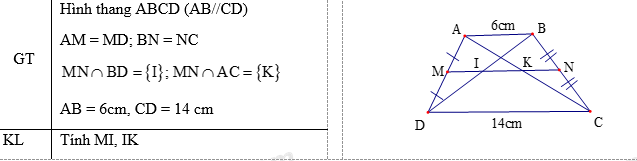 Cho hình thang ABCD (AB // CD), M là trung điểm của AD, N là trung điểm của BC. Gọi I, K theo thứ tự là giao điểm của MN với BD, AC. Cho biết AB = 6cm, CD = 14cm. Viết GT-KL và tính độ dài MI, IK.