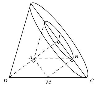 \( \Rightarrow {V_2}\) là khối nón có chiều cao \({h_2} = AI = AD = 4\), \({r_2} = IB = BC = 3\).