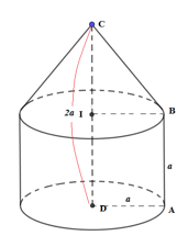 Thể tích khối tròn xoay tạo thành khi quay hình thang vuông đó quanh cạnh CD là: \(V = {V_1} + {V_2} = \dfrac{4}{3}\pi {a^3}\).