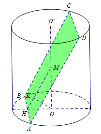 Trong mặt phẳng \(\left( MHO \right)\) kẻ \(OK\bot MH\), \(\left( K\in MH \right)\) khi đó góc giữa \(O{O}'\) và mặt phẳng \(\left( \alpha  \right)\) là góc \(\widehat{OMK}=30{}^\circ \). Xét tam giác vuông \(MHO\) ta có \(HO=OM\tan 30{}^\circ \)\(=R\tan 30{}^\circ \)\(=\frac{R\sqrt{3}}{3}\).