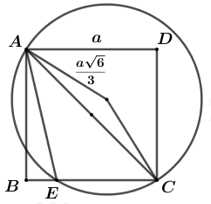 Cho hình vuông \(ABCD\) có cạnh bằng \(a\). Một đường tròn có bán kính bằng \(\dfrac{{a\sqrt 6 }}{3}\) qua hai đỉnh \(A,\,\,C\) và cắt cạnh \(BC\) tại \(E\). Độ dài \(AE\) và số đo góc \(BAE\) lần lượt là