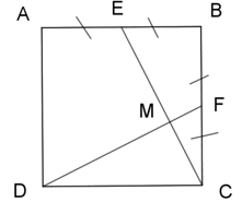 Cho hình vuông ABCD, gọi E và F theo thứ tự là trung điểm của AB, BC, CE cắt DF ở M. Tính tỷ số \(\frac{{{S}_{\Delta CMD}}}{{{S}_{ABCD}}}\)?