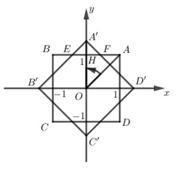 Cho hình vuông ABCD trong đó \(A\left( {1;1} \right),B\left( { - 1;1} \right),C\left( { - 1; - 1} \right),D\left( {1; - 1} \right)\). Xét phép quay \(Q\left( {O;{\pi \over 4}} \right)\). Giả sử hình vuông A’B’C’D’ là ảnh của ABCD qua phép quay đó. Gọi S là diện tích hình vuông A’B’C’D’ nằm ngoài hình vuông ABCD. Tính S.