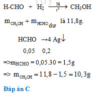 Cho hỗn hợp HCHO và H2 đi qua ống đựng bột Ni nung nóng. Dẫn toàn bộ hỗn hợp thu được sau phản ứng vào bình nước lạnh để ngưng tụ hơi chất lỏng và hòa tan các chất có thể tan được,thấy khối lượng bình tăng 11,8g.Lấy dung dịch trong bình cho tác dụng với dd AgNO3/NH3 thu được 21,6g Ag. Khối lượng CH3OH tạo ra trong phản ứng hợp H2 của HCHO là: