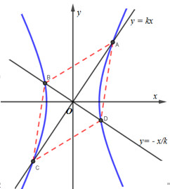 Cho hypebol \((H):{{{x^2}} \over {{a^2}}} - {{{y^2}} \over {{b^2}}} = 1\,\,(b > a > 0)\). Cho \(k\) là một số thực dương. Xét các đường thẳng \(({d_1}):\,\,y = kx,({d_2}):\,\,y = - {1 \over k}x\) đều cắt (H) tại 2 điểm phân biệt. Gọi A và C lần lượt là giao điểm của \(({d_1})\) với (H) (A nằm trong góc phần tư thứ nhất). Gọi B và D lần lượt là giao điểm của \(({d_2})\) với (H) (B nằm trong góc phần tư thứ hai). Tìm k sao cho hình thoi ABCD có diện tích nhỏ nhất.