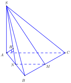 \( \Rightarrow \left( {SMN} \right)//AC \Rightarrow d\left( {SM;AC} \right) = d\left( {AC;\left( {SMN} \right)} \right) = d\left( {A;\left( {SMN} \right)} \right)\).