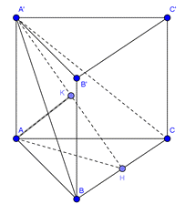 Kẻ \(AK \bot A'H\) , lại có \(AK \bot BC \Rightarrow AK \bot \left( {A'BC} \right) \Rightarrow {d_{A \to \left( {A'BC} \right)}} = AK = \dfrac{a}{2}\)