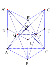 Gọi \(DEF\) là thiết diện của lăng trụ khi cắt bởi \(\left( {MNP} \right)\). Khi đó \(D,E,F\) là trung điểm của các cạnh \(AA',BB',CC'\).