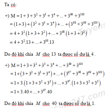 Cho \(M = 1 + 3 + {3^2} + {3^3} + {3^4} + ... + {3^{99}} + {3^{100}}.\) Tìm số dư khi chia \(M\) cho \(13\), chia \(M\) cho \(40\).