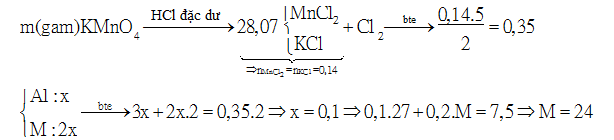 Cho m gam KMnO4 tác dụng với dung dịch HCl đặc dư thu được dung dịch X chứa HCl dư và 28,07 gam hai muối và V lít khí Cl2 (đktc). Lượng khí Cl2 sinh ra oxi hoá vừa đủ 7,5 gam hỗn hợp gồm Al và kim loại M có tỉ lệ số mol Al : M=1:2. Kim loại M là