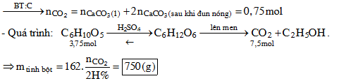 Cho m gam tinh bột lên men thành ancol etylic với hiệu suất 81%. Toàn bộ lượng CO2 sinh ra thu được hấp thụ hoàn toàn vào dung dịch Ca(OH)2, thu được 550 gam kết tủa và dung dịch X. Đun kỹ dung dịch X thu thêm được 100 gam kết tủa. Giá trị của m là: