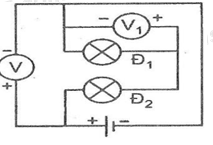 Cho mạch điện có sơ đồ như hình vẽ, trong đó vôn kế V có số chỉ 5,8V; vôn kế V1 có số chỉ 3,0V. Hãy tính hiệu điện thế giữa hai đầu bóng đèn Đ2.