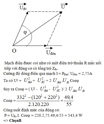 Cho mạch điện gồm một bóng đèn dây tóc mắc nối tiếp với một động cơ xoay chiều một pha. Biết các giá trị định mức của đèn là 120V – 330W, điện áp định mức của động cơ là 220V. Khi đặt vào hai đầu đoạn mạch một điện áp xoay chiều có giá trị hiệu dụng 332V thì cả đèn và động cơ đều hoạt động đúng công suất định mức. Công suất định mức của động cơ là: