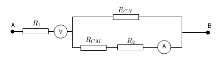 Điện trở toàn mạch được xác định bởi biểu thức \[{R_{AB}} = {R_1} + \frac{{{R_{CN}}.({R_{CM}} + {R_2})}}{{{R_{CN}} + {R_{CM}} + {R_2}}} = 12 + \frac{{x.(24 - x + 12)}}{{x + 24 - x + 12}} = 12 + \frac{{x(36 - x)}}{{36}}\Omega \]