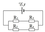 Cho mạch điện như hình bên. Biết E = 7,8 V; r = 0,4 Ω; R1 = R2 = R3 = 3 Ω; R4 = 6 Ω. Bỏ qua điện trở của dây nối. Dòng điện chạy qua nguồn điện có cường độ là
