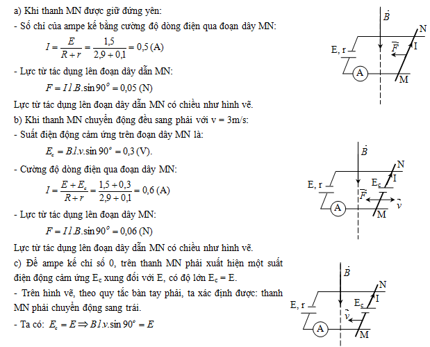 c) Muốn ampe kế chỉ 0, MN phải chuyển động về hướng nào với vận tốc bao nhiêu?