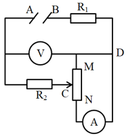 Cho mạch điện như hình vẽ. Biết \\({U_{AB}} = 9V\\) và duy trì ổn định, \\({R_1} = {R_2} = 1\\Omega ,\\,\\,MN\\) là một biến trở có điện trở toàn phần \\({R_{MN}} = 10\\Omega \\). Vôn kế có điện trở vô cùng lớn, Ampe kế có điện trở nhỏ không đáng kể. Điều chỉnh vị trí của C để công suất tiêu thụ trên toàn biến trở là lớn nhất. Tính công suất đó.