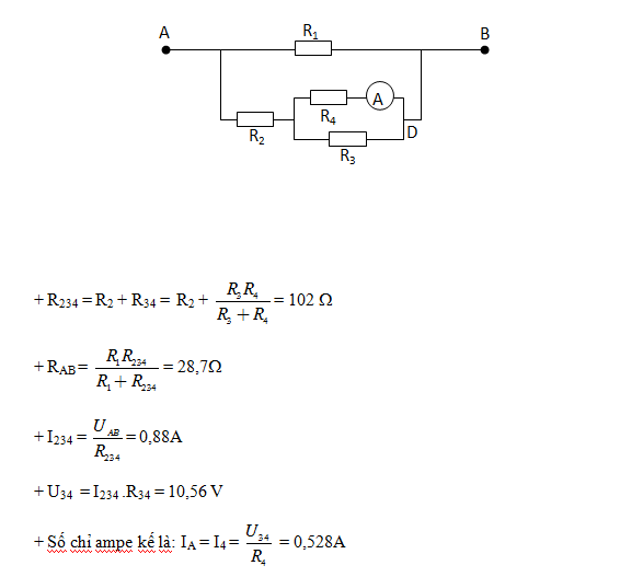 a) Cho R3 = 30W. Tính điện trở tương đương của đoạn mạch AB và số chỉ của ampe kế trong hai trường hợp: