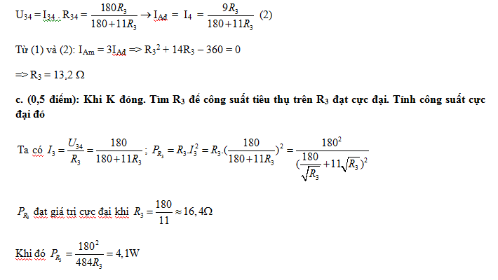 c) Khi K đóng. Tìm R3 để công suất tiêu thụ trên R3 đạt cực đại. Tính công suất cực đại đó.