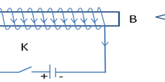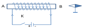 Cho mạch điện như hình vẽ: Khi đóng khóa K, một đầu kim nam châm bị hút vào ống dây AB.
