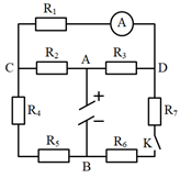 Cho mạch điện như hình vẽ. \\({R_1} = {R_3} = {R_4} = {R_5} = 6\\Omega ;\\,\\,{R_2} = 12\\Omega ;\\,\\,{R_6} = 4\\Omega ;\\,\\,{R_7} = 2\\Omega ;\\,\\,U = 12V\\). Bỏ qua điện trở của Ampe kế và khóa K. Tính số chỉ của Ampe kế khi K mở.