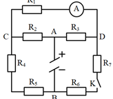 Cho mạch điện như hình vẽ. \\({R_1} = {R_3} = {R_4} = {R_5} = 6\\Omega ;\\,\\,{R_2} = 12\\Omega ;\\,\\,{R_6} = 4\\Omega ;\\,\\,{R_7} = 2\\Omega ;\\,\\,U = 12V\\). Bỏ qua điện trở của Ampe kế và khóa K. Tính số chỉ của Ampe kế khi K mở.