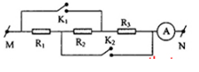Cho mạch điện như hình vẽ: R2 = 10W, UMN = 30V. Biết khi K1 đóng, K2 mở ampe kế chỉ 1A. Khi K1 mở, K2 đóng thì ampe kế A chỉ 2A. Số chỉ của ampe kế A khi cả 2 khóa K1 và K2 cùng đóng là?